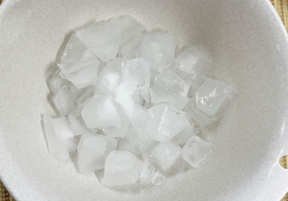 ①:ボウルに冷凍ホタテが隠れるほどの氷を入れます。