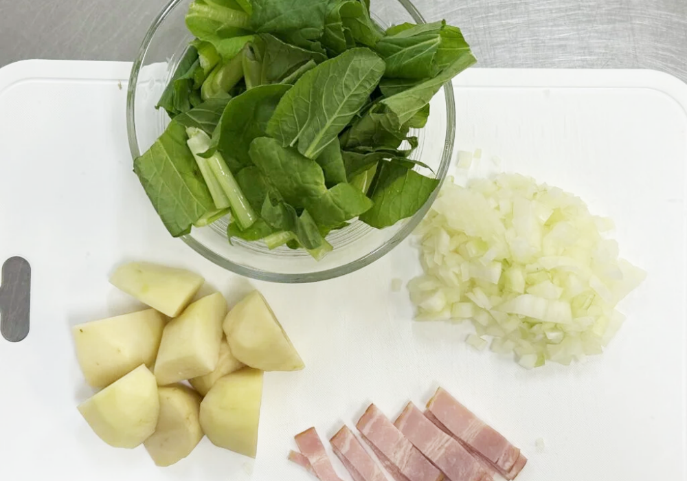 ④ジャガイモがやわらかくなったら①、小松菜を入れます。