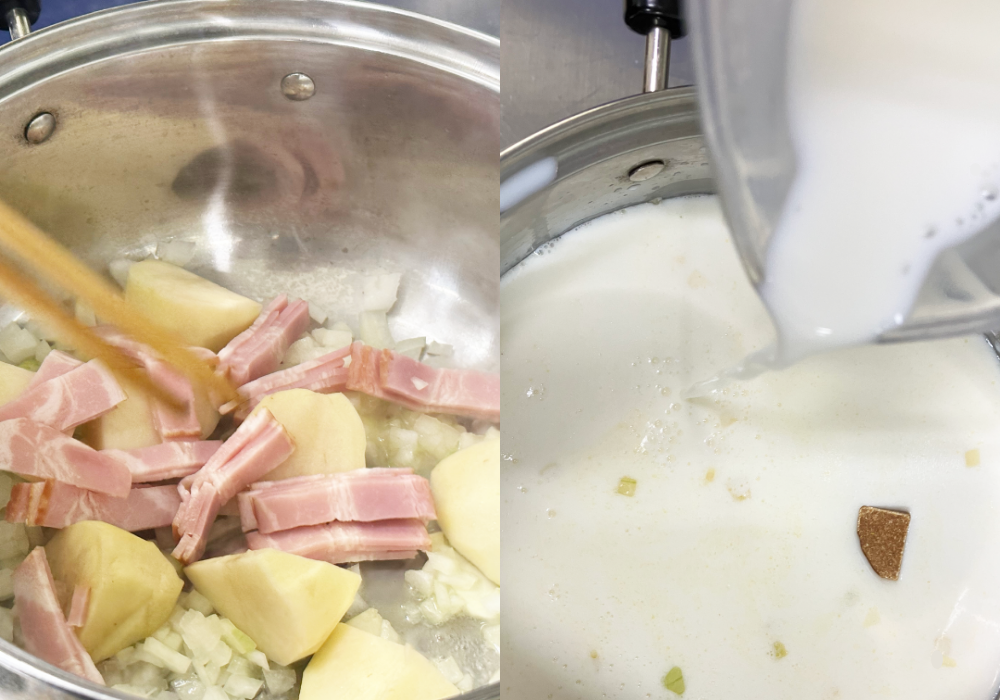 牛乳を入れてのばし、コンソメ1個を加えて加熱します。