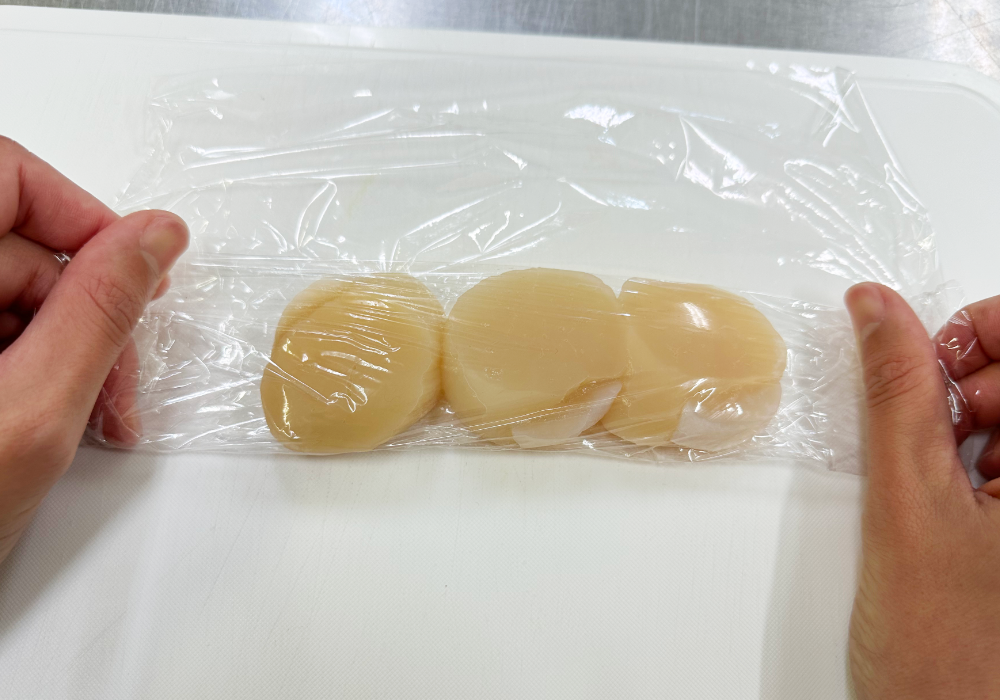 ①:ホタテの水気を軽くふき、2~3個ずつ少量でラップします。