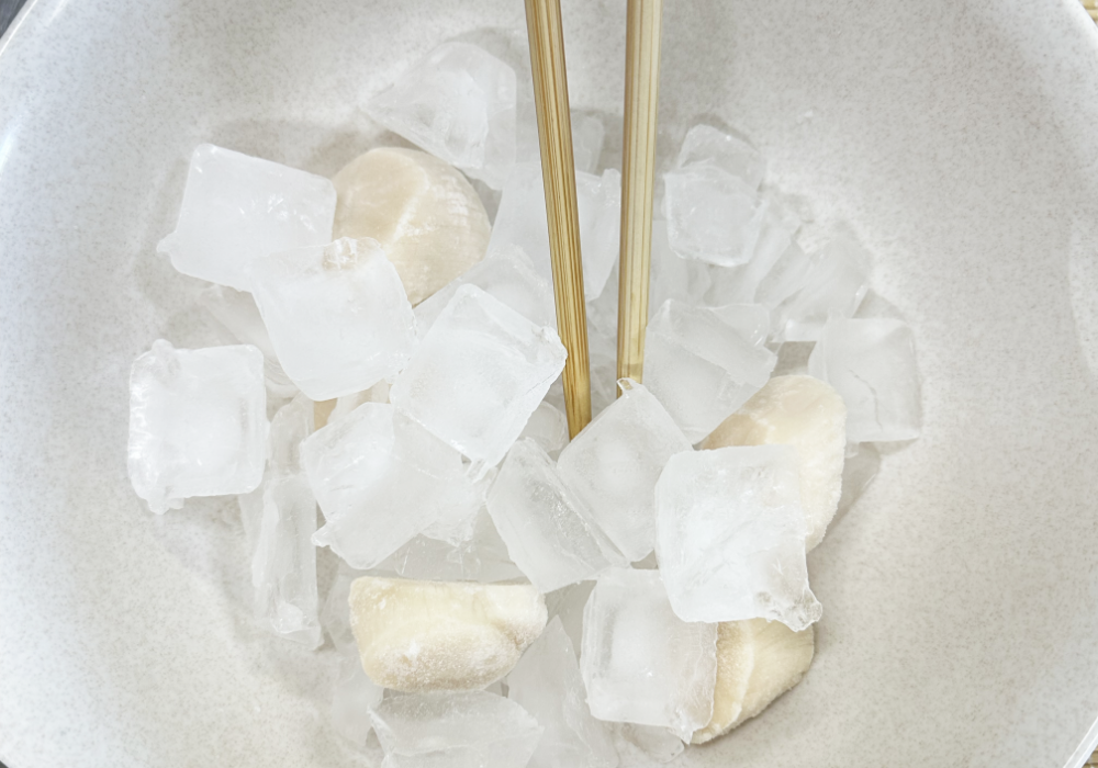③:軽くかき混ぜて、冷凍ホタテが氷に埋まるようにします。