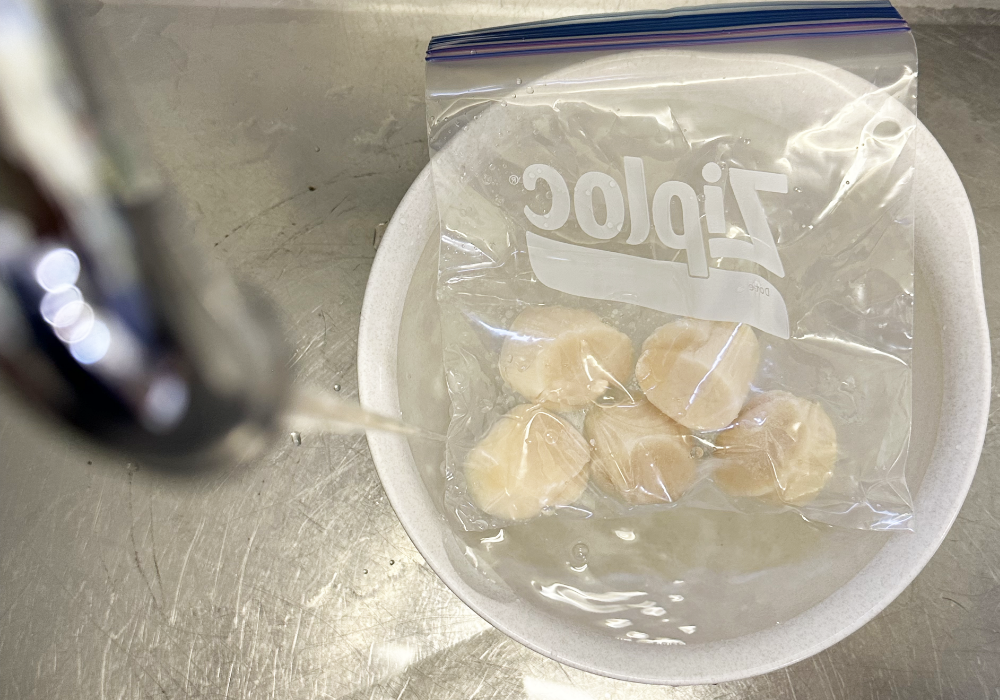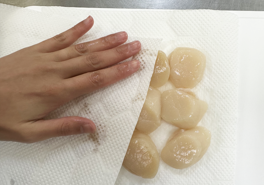 (中心までやわらかくなっていたら全解凍、中心部が少し凍っていたら半解凍、ホタテを触ってみて、中心に芯がのこっていなかったら解凍完了です。)