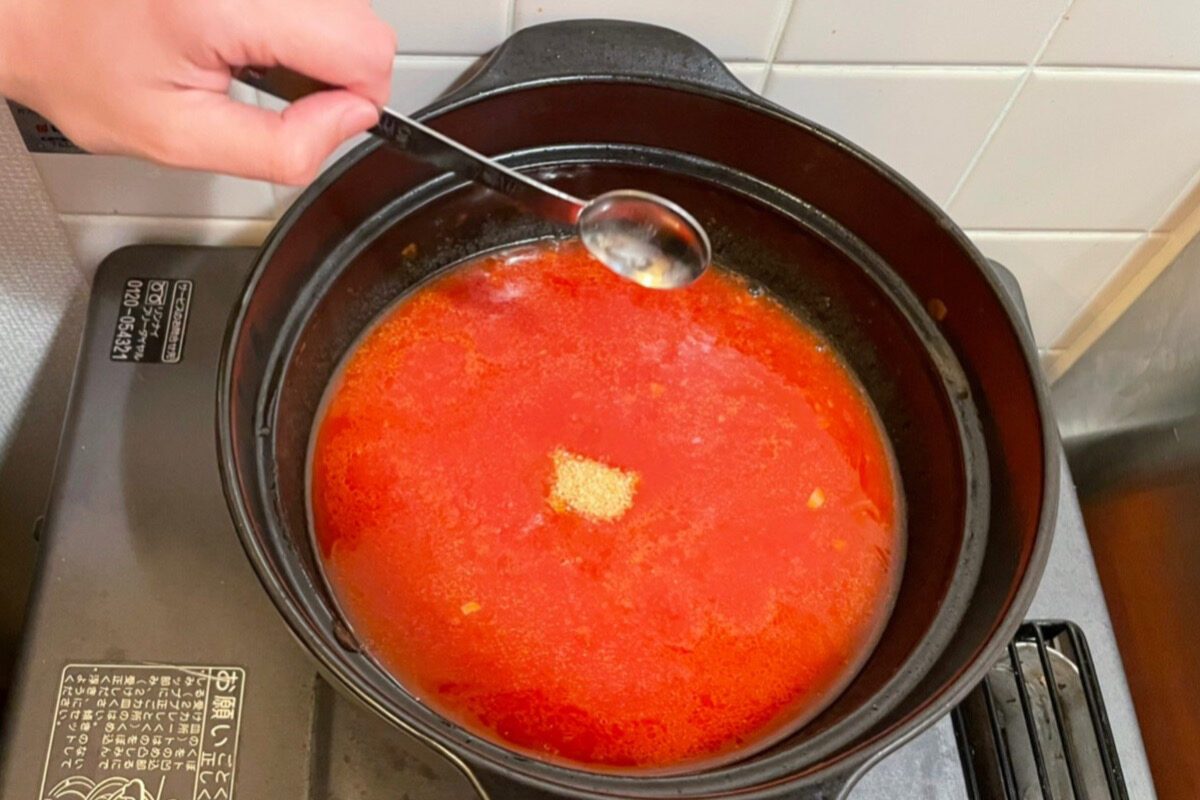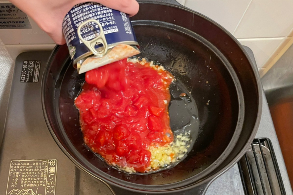 ニンニクの良い香りが出たら、水煮トマトをつぶしながら加えます。そして他のトマトスープの材料を加えて混ぜた後、中火にかけます。